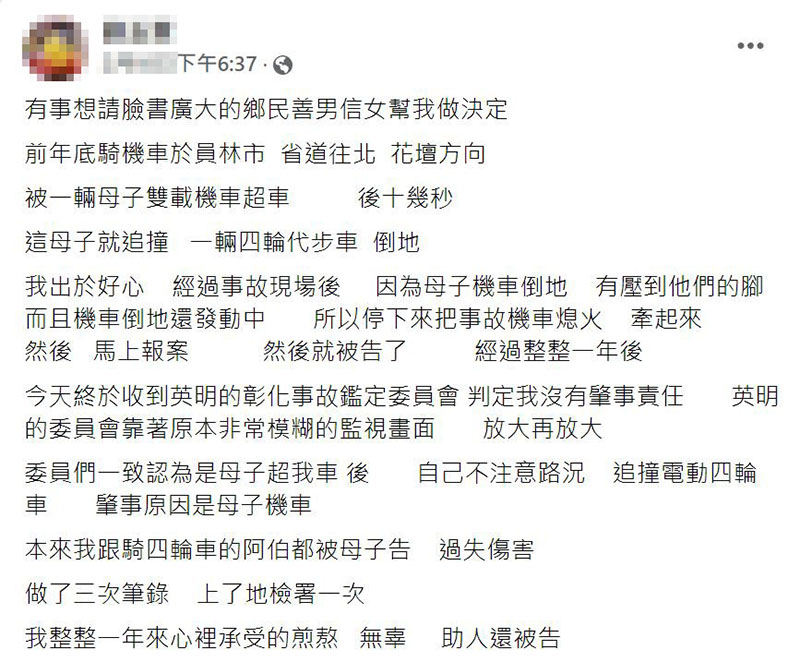 原PO表示,他前年底騎車行經彰化員林往花壇方向,被一輛母子雙載機車超車,但不久後母子就追撞一輛四輪代步車倒地,「通過事故現場後,發現母子的機車倒地,壓到2人的腳,機車倒地還發動中」、「我出於善心,所以停下來把事故機車熄火牽起,馬上報案,然後我就被告了……」。