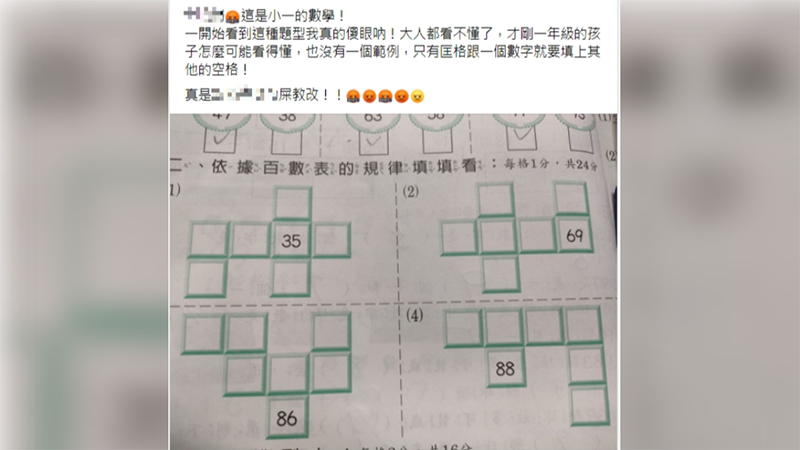 女網友在臉書《爆怨公社》PO出自己小一孩子的數學作業表示「這是小一的數學!一開始看到這種題型我真的傻眼」,只見題目中要求學生依據百數表的規律填寫正確的數字,讓她氣得狂飆三字經,破口大罵「連我們大人都看不懂了,何況是小學一年級的孩子,也沒有範例,就直接要填數字,真是他X的教改」。