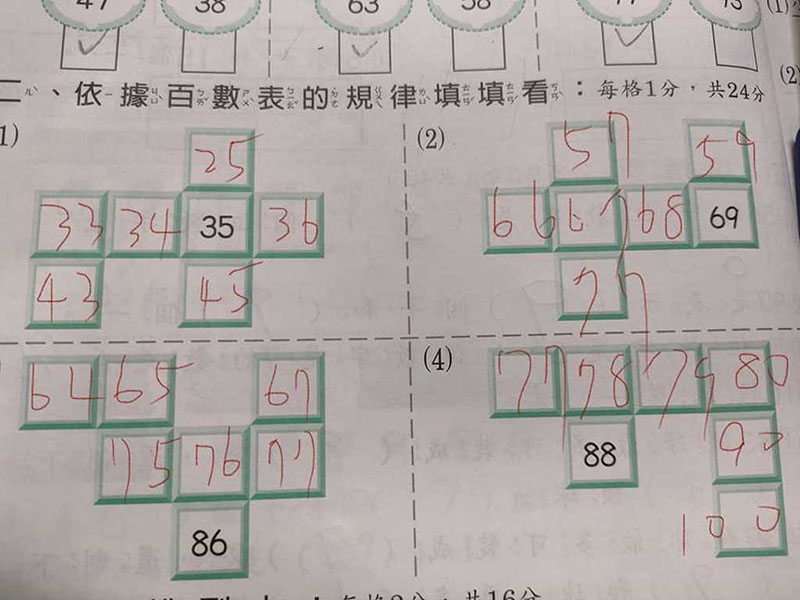 文章曝光後,引起正反兩面的網友討論,事實上該題寫明依據「百數表」規律填空格,百數表為有10行、10列的表格,由左至右按順序列出1至100的數字,表格中不論橫行、豎行、斜行都有其規律。