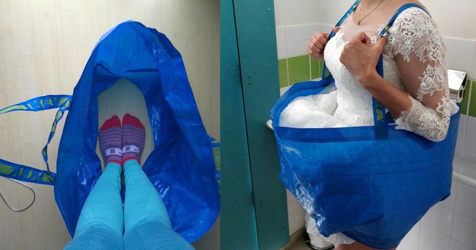 她在IKEA購物袋底部剪了一個洞,先將雙腳踩進洞中,再將購物袋的提手當成肩帶穿在身上。