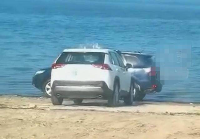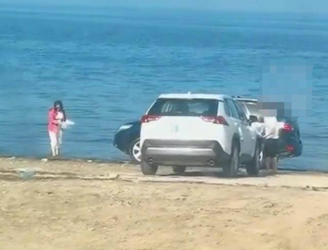 根據網友拍下的視訊顯示,兩輛SUV停在大海旁邊,一名女子用臉盆從海裡裝水,直接潑在車上,一名男子正在用布擦拭車身。