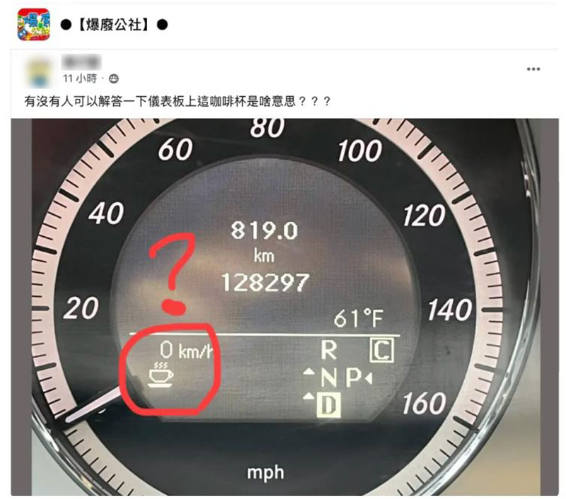 原PO在臉書《爆廢公社》上發出提問,車子的儀表板左下方突然冒出一個小小的咖啡杯符號,但他不懂其中意涵「有沒有人可以解答一下,儀表上這咖啡杯是啥意思?」