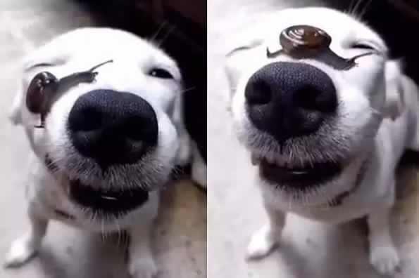 這隻狗就完全不一樣,呆呆傻傻的也不知道害怕,一隻蝸牛不知怎麼爬到了它臉上,它還笑著跑到主人身邊給主人看..