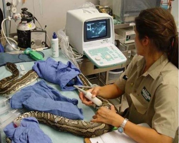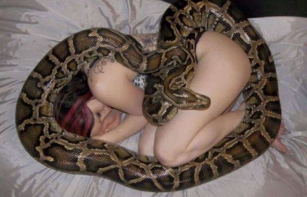 ▼有一天蟒蛇突然不再進食了,不管女子餵牠什麼,牠都不吃不喝。女子急忙把蟒蛇送到獸醫院檢查。獸醫聽完女子的描述,問她是不是每天都跟蟒蛇一起睡覺,而蟒蛇是不是都跟牠靠得很近,或是纏在她身上睡?