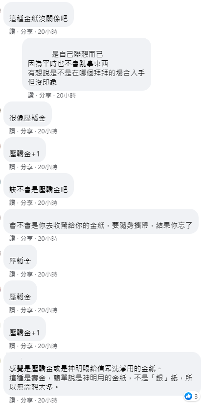 「感覺是壓轎金或是神明賜給信眾洗淨用的金紙,這種是壽金,簡單說是神明用的金紙,不是銀紙,所以無需想太多」、