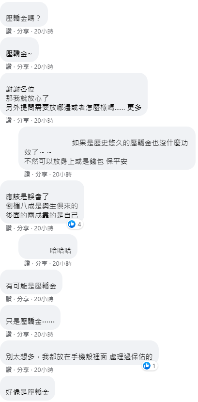 貼文一出,網友紛紛回應「好像是壓轎金耶?」、「壓轎金+1」、