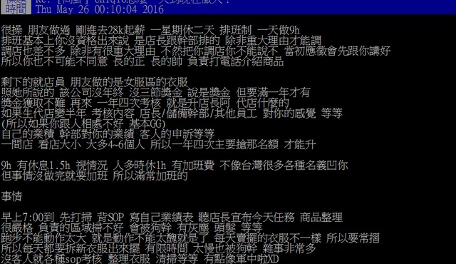 重點是,在這工作很軍事化像在當兵,網友解釋主因是日本人的公司,很重SOP,工作內容必須照表操課,像是打卡要和同事互相問好,拆新衣上架也有標準時間,連休息室也不可以堆放一堆飲料,很多人受不了這樣的文化,他說朋友在這做了1年半,大約半年就換一批人同事。