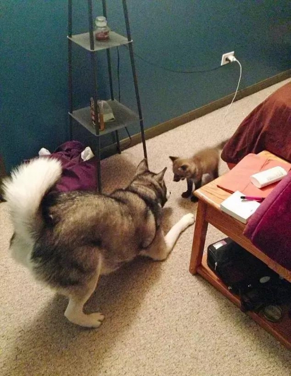 由於一直以來,都是哈士奇帶著小狐狸,因此小狐狸長大後,表現也變得跟牠有點像,比如看到主人來了就會主動翻過肚子要摸摸,還會坐下和握手喔!