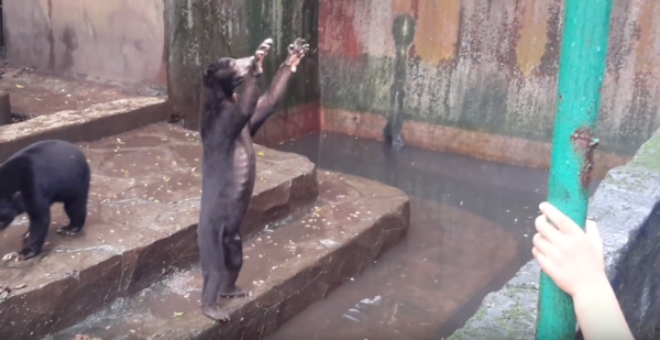 原本以為是很可愛的馬來熊因為肚子餓才要跟遊客乞求食物,但仔細一看,才發現這三隻馬來熊全都瘦成不成熊樣!