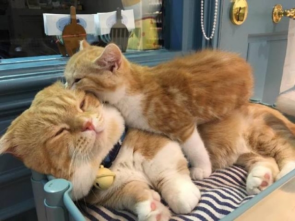 4.這隻橘貓給自己舔毛洗澡,沒想到另外一隻貓咪竟然主動抱起牠開始幫舔毛!根本男友力Max,真希望這是我男友……