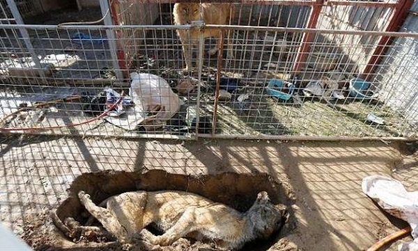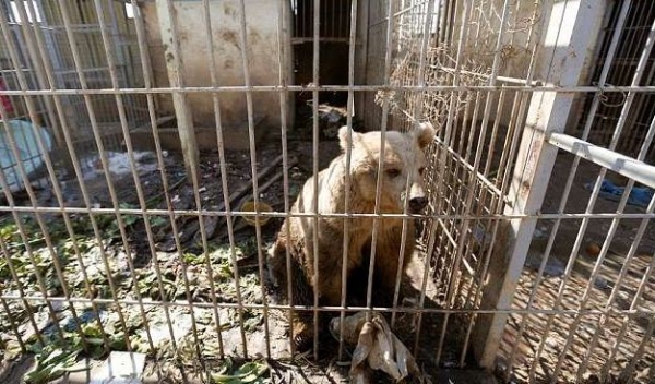 ▼棕熊在骯髒的籠子內走來走去,眼神絕望。旁邊的獅子則緊緊盯著前方被餓死的母獅屍體。