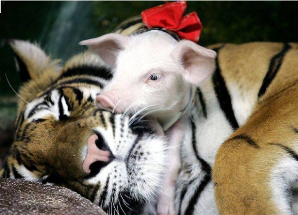 泰國動物園裡,一只老虎媽媽實在無法接受自己的孩子已經死去的事實,終日以淚洗面,身體也日漸蕭條。工作人員為了幫助這只虎媽,他們想出了一個辦法。用粵語來說,就是扮豬食老虎。