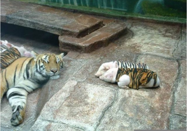 工作人員用虎皮穿在幾只小豬身上,然後把它們送到老虎媽媽的身邊,讓虎媽以為,它們就是自己的孩子。幾個穿著虎皮的小豬仔安靜地睡在虎媽的身上。