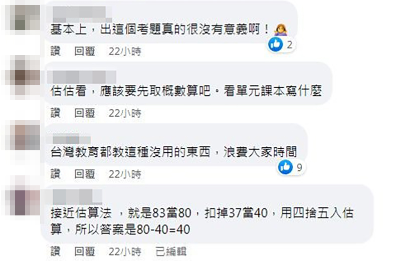 就有家長點出解題關鍵在於「估估看」三個字,也就是需要「先估算再計算」,將83以及37兩個數四捨五入後再計算,因此答案將會是「80-40=40」,而不是先把答案「相減後才估算」。