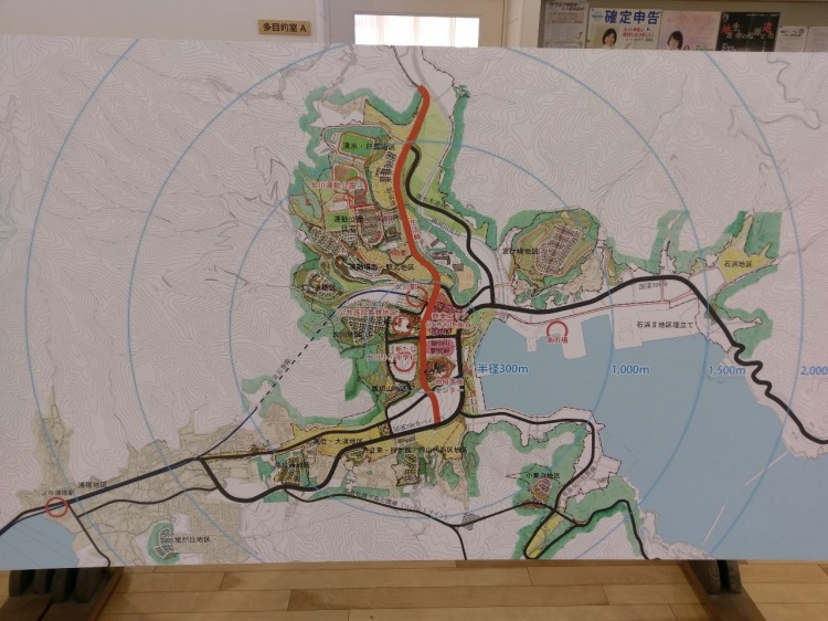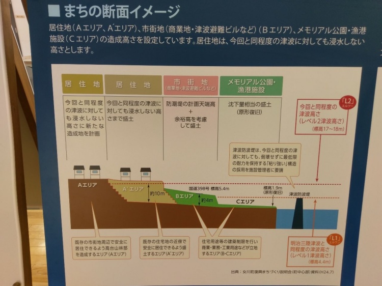 首先海岸線的每個小漁港城鎮的市中心,都會展示該地的重建規劃,因為當年幾乎每個都被海嘯給破壞殆盡,所以就做出全新的都市規劃,不沿用過去的路,重新考量每一區的土地高度、道路設計,讓未來災害若再度發生,可以讓居民快速疏散到高處。