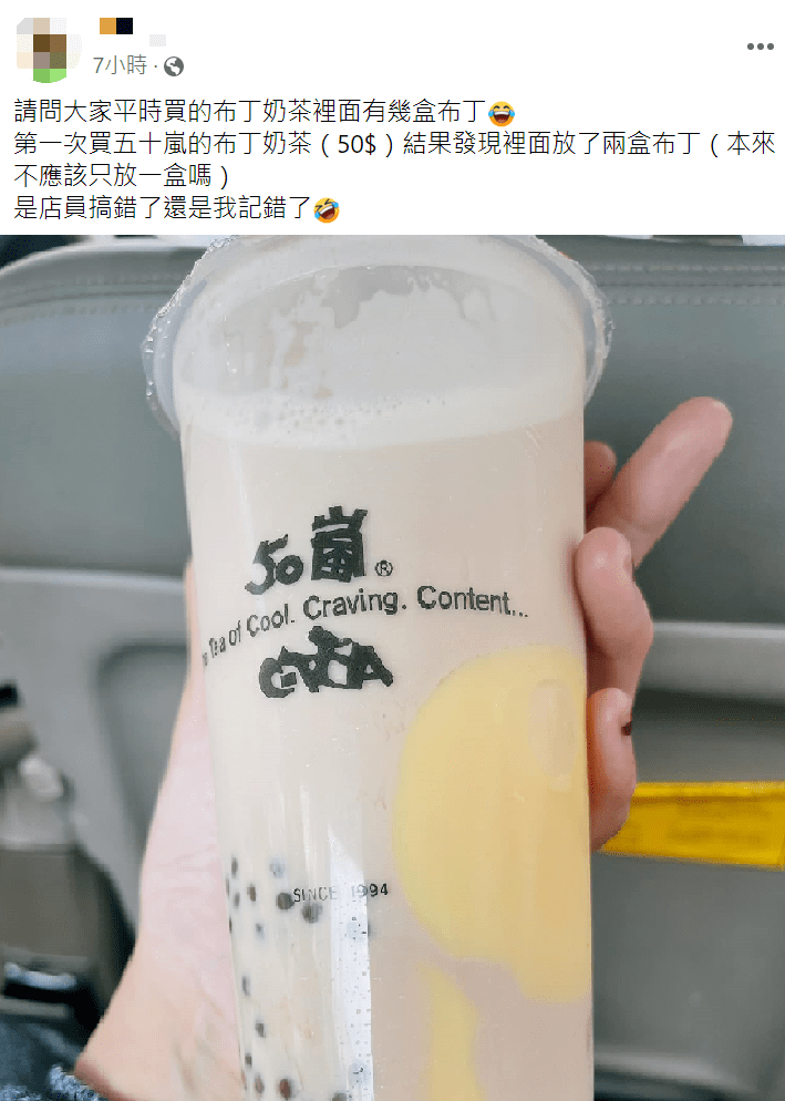 原PO近日在臉書社團「爆廢公社公開版」發文,表示自己第一次購買50嵐的布丁奶茶,卻發現裡面加了兩顆布丁,讓她疑惑詢問,「請問大家平時買的布丁奶茶裡面有幾顆布丁?本來不應該只放1顆嗎?是店員搞錯還是我記錯了」。