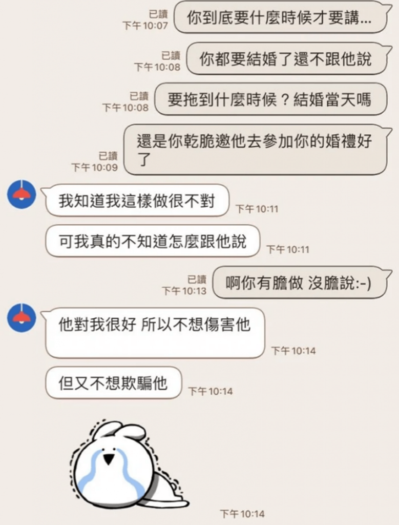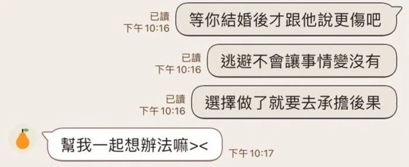 原PO也透露,自己在聽到此事時是感到相當傻眼,同時也向閨蜜指出,應該要趕緊跟男友說出實情,並且向閨蜜提醒,逃避並不會讓事情化無,因此應該在選擇做了這件事後,去勇敢承擔後果。
