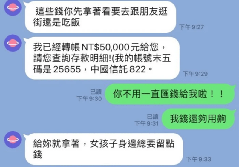 半年前該閨蜜在直播中認識1名「乾爹」,對方每月都會「抖內」好幾萬,閨蜜也接受對方「金援」,偷偷與對方約會,原PO曝光「乾爹」與閨蜜的對話,「乾爹」說已轉帳5萬讓閨蜜吃飯逛街「給妳就拿著,女孩子身邊總要留點錢。」
