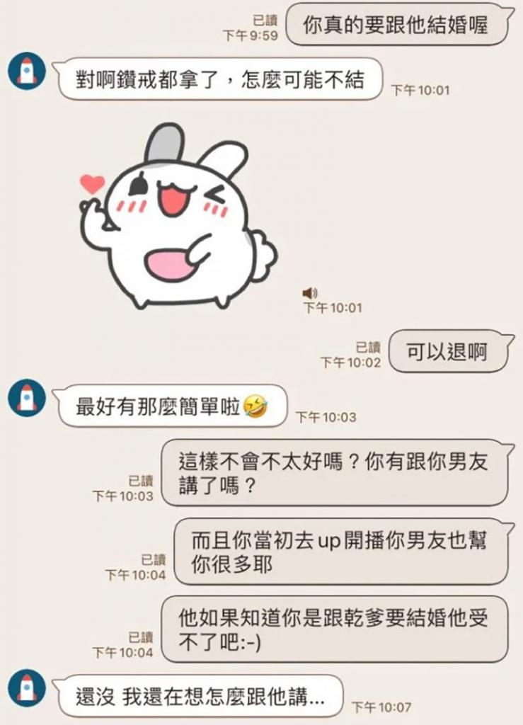 原PO說,該閨蜜近日竟答應與「乾爹」結婚,並收下對方的求婚鑽戒,閨蜜的男友卻還被矇在鼓裡。