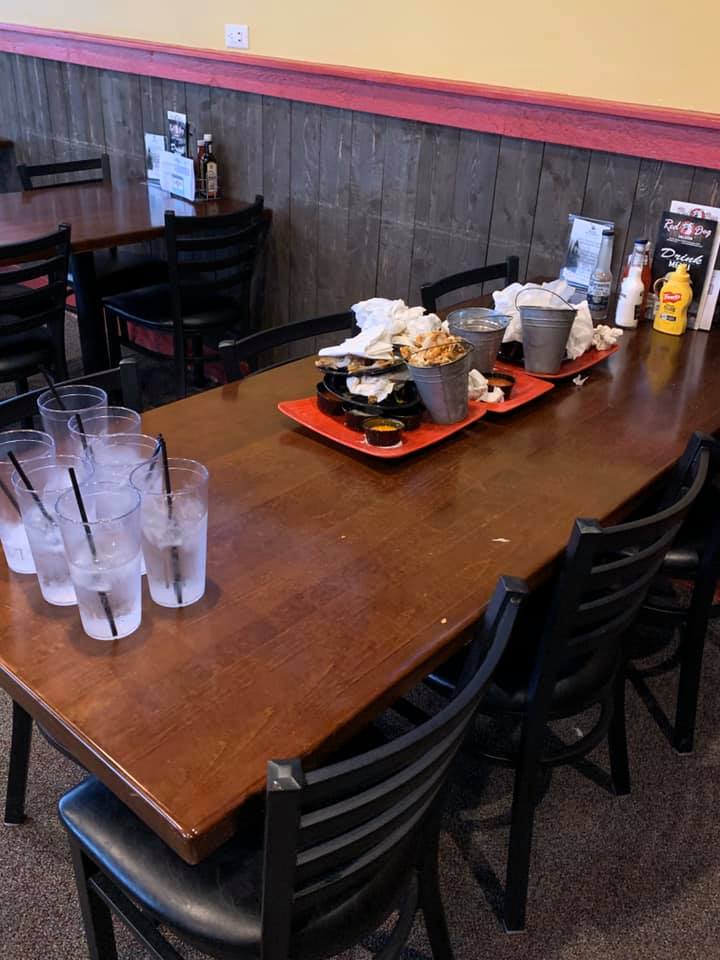 他們把所有的空盤和吃完的雞骨頭、垃圾堆到桌子中央,還用紙巾擦乾淨桌面,飲料杯則整齊擺在旁邊。