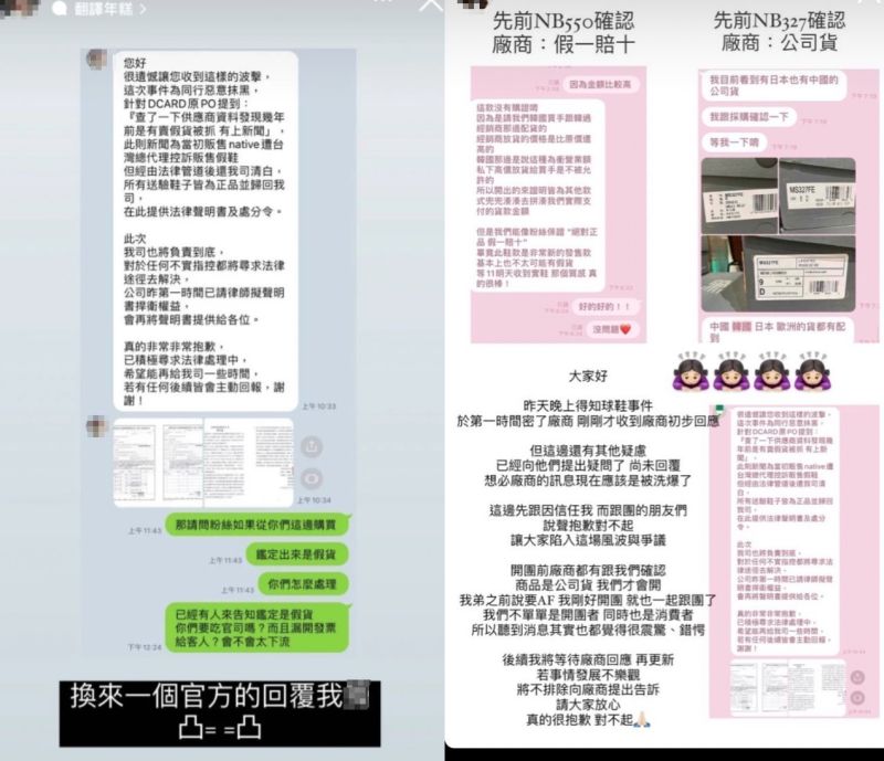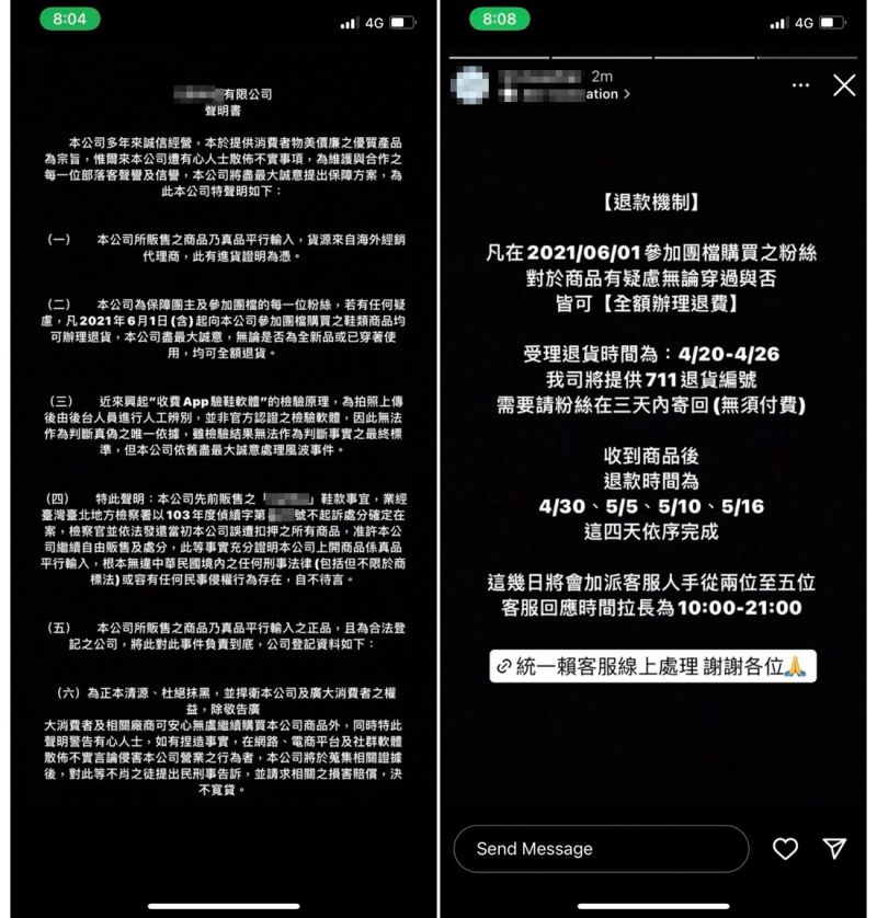 根據截圖,廠商宣稱「這次事件為同行惡意抹黑,我司將負責到底,對於任何不實指控都將尋求法律途徑去解決,公司昨第一時間已請律師擬聲明書捍衛權益,會再將聲明書提供給各位」。而業者也在IG發出聲明,內容提到「本公司所販售之商品乃真品平行輸入,貨源來自海外經銷代理商,此有進貨正名為憑」,並表示只要是參與團購的每一位粉絲,若有任何疑慮,凡2021年6月1日(含)起有購買團購之鞋類商品,均可辦理退貨,「本公司盡最大誠意,無論是否為全新新品或已穿著使用,均可全額退貨」。