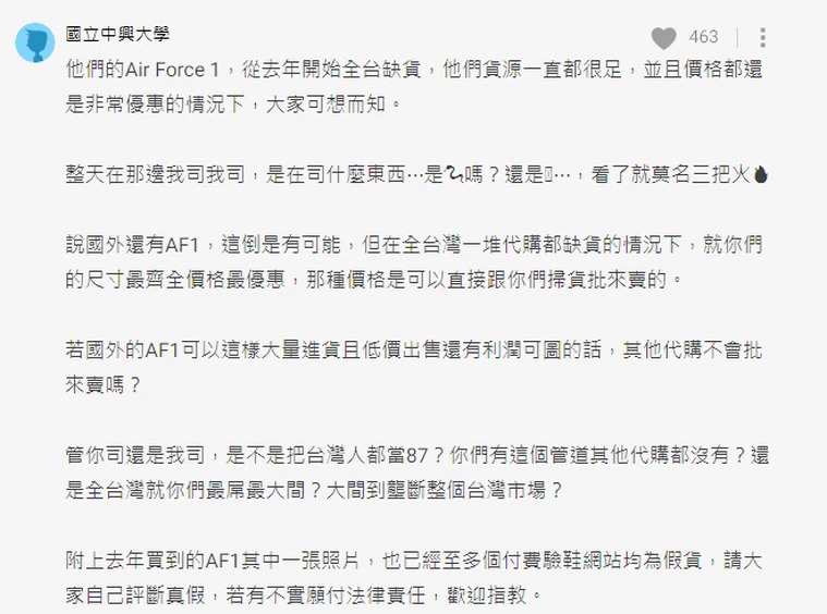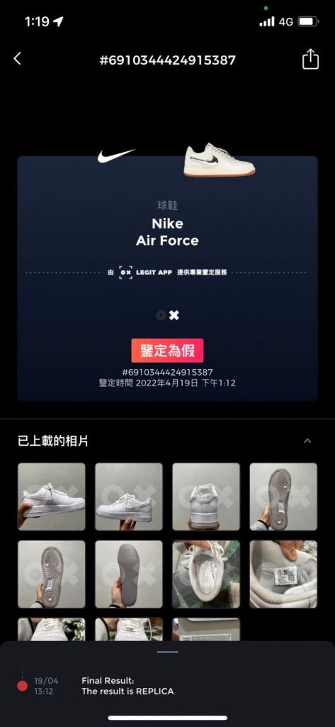 網友指出,因為有特定喜歡的網美前陣子開球鞋團購,且是最近又紅回來的NIKE Air force1,由於市售多家知名運動品牌店實在是一雙難求,因此看到網美開團時,尺寸齊全且價格落在3000元上下,與男友都購入了球鞋,豈料看見《Dcard》上的文章,才驚覺自己也上當受騙,於是使用了付費APP「Legit App」來驗鞋,花了89元台幣,經鑑定結果顯示為「假的」。
