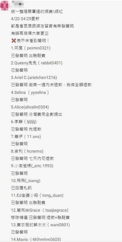 有網友整理出一份上百名網紅開團名單,包括華航林依晨、「Angelina」陳怡安、美妝YouTuber黃小米、大饅、美食部落客巨鳥胃77等。網紅們昨深夜紛紛在IG限時動態發文說明並道歉,也提供消費者後續退費管道。