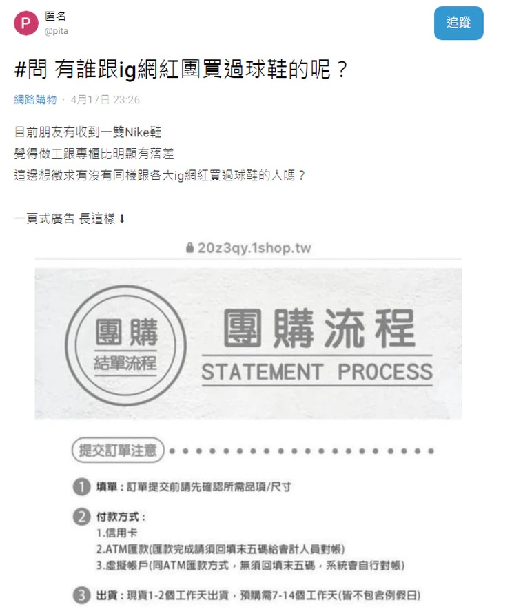 一名網友透露,自己向網美訂購球鞋,但是收到後覺得做工跟專櫃相比明顯有落差,因此想徵求看看「有沒有人跟他一樣跟各大IG網紅、YTR購買開團球鞋」,並貼出當時購買的一頁式廣告,沒想到不問沒事,問了就出事,不少人看到該「一頁式廣告」立刻驚覺自己也在上頭購買過開團球鞋。