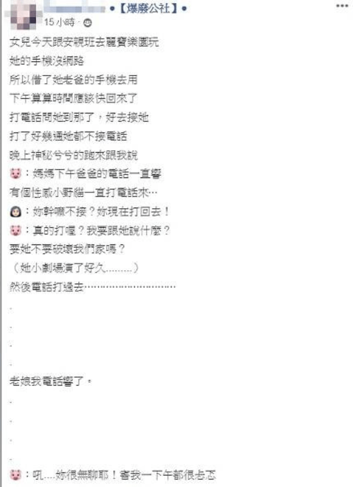 當天女兒要跟安親班去樂園玩,但因女兒的手機沒有網路,所以只好先借爸爸的來用,到了下午時原PO想說女兒的活動快結束了,就打電話過去,但是女兒並沒有接起來,結果女兒回家時,才向原PO坦承「下午爸爸手機一直響,有個『性感小野貓』一直打電話來。」。