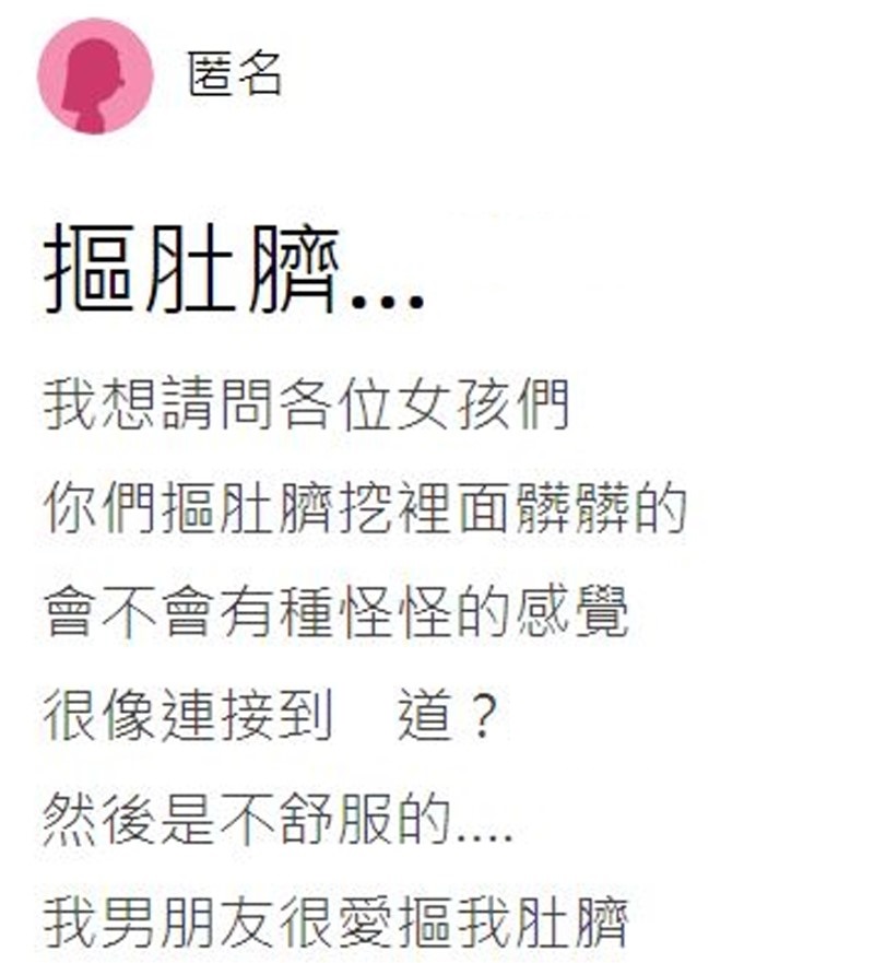 有女網友在Dcard發文表示,男友超愛摳她的肚子,每次她都會出現「怪怪的感覺,很像連接到尿道或陰道」不太舒服。另外營養師黃淑惠也在節目中分享,替就讀小學的女兒洗澡順便清潔肚臍時,也被抱怨「不要一直弄,我想上廁所」,一股癢感、想尿尿的感覺隨著手指摳挖頻頻出現。