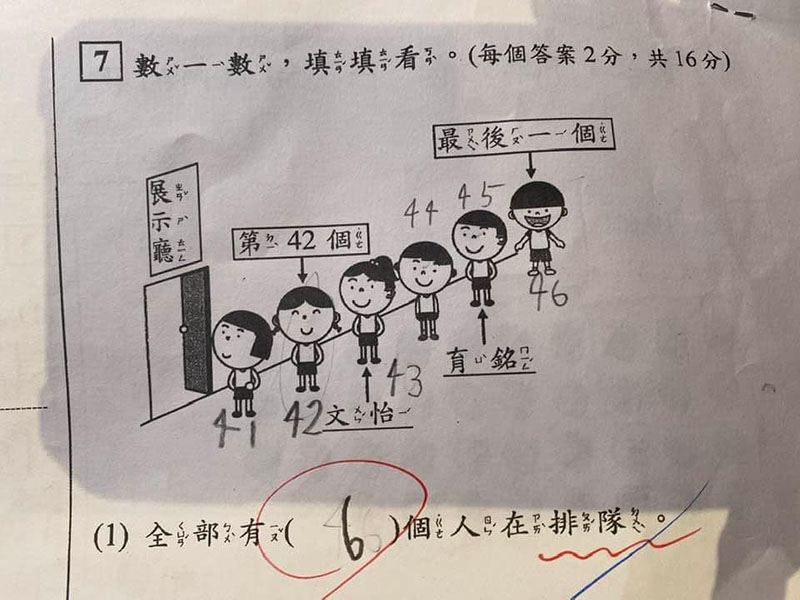 陳昶宇在臉書貼出考卷,只見題目問全部有幾個人在排隊?而圖上總共畫了6個人,其中一人上頭標記「第42人」,結果答案是「6人」,但不少人認為「46人」才對。