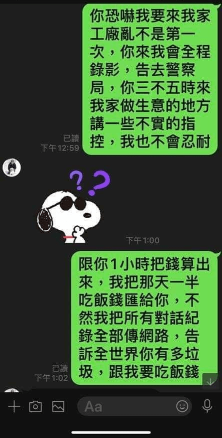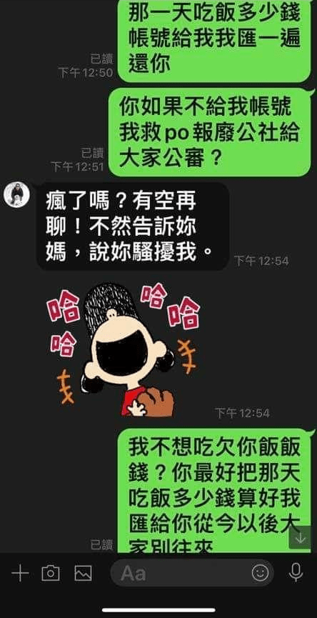 我個人覺得莫名其妙,一個月收入好幾好幾十萬的人,跟我計較我都忘記的飯錢,而且當天消費不到一千塊吧!