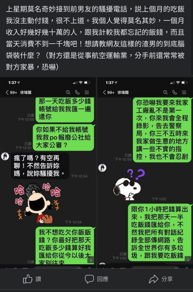 一名女網友在臉書分享與前男友的通訊對話,表示前男友跟自己追討飯錢,讓她怒斥「一個月收入好幾十萬還跟我計較?!」。