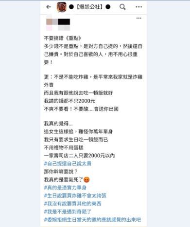 一位女網友po文抱怨,她生日當天要和一位追求者吃飯,結果對方不僅只想買炸雞慶祝而已,甚至還認為後面自己提出的餐廳太貴,讓她感到莫名其妙,「我是不是遇到奇葩了」,故事一出,讓眾人爭相討論。