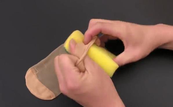 第二步:將滴有花露水的百潔布,裝進舊絲襪裡面。