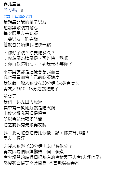 男友:你為甚麼不丟下去一起煮就好,出來玩又要讓我等你吃飯?