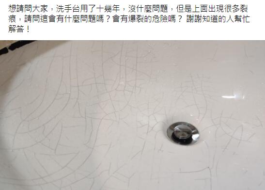 原PO在臉書社團發文,表示「洗手台用了十幾年,沒什麼問題,但是上面出現很多裂痕,請問這會有什麼問題嗎?會有炸 裂的危險嗎? 謝謝知道的人幫忙解答!」。