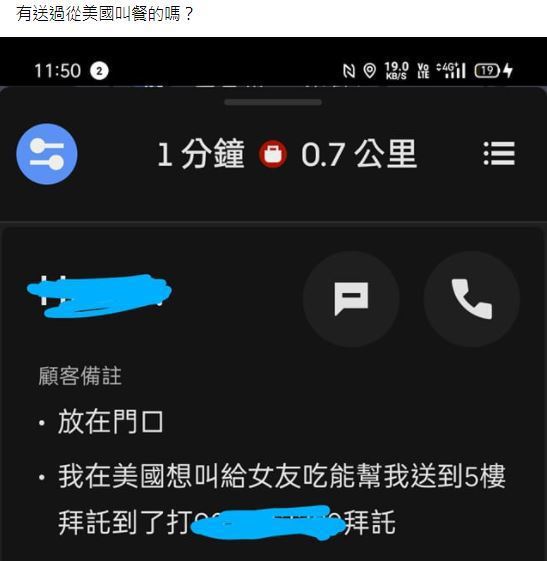 該外送員在臉書「外送員討論區」發文,「有送過從美國叫餐的嗎?」他分享最近接到一筆有趣的訂單,對方在備註上留下一支電話,並寫道,「我在美國,想叫外送給女友吃」,希望他可以將餐點送到5樓,到了之後撥打該電話。