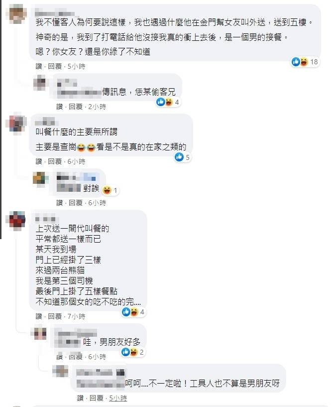 不過,有外送員分享真實案例,「我也遇過男友在金門,幫女友叫外送,神奇的是,我到了打電話給他沒接,我真的衝上去後,是一個男的接餐,嗯?你女友?還是你綠了不知道」、「上次送一間代叫餐的,平常都送一樣而已,某天我到場門上已經掛了三樣,來過兩台熊貓,我是第三個司機,最後門上掛了五樣餐點,不知道那個女的吃不吃得完」。