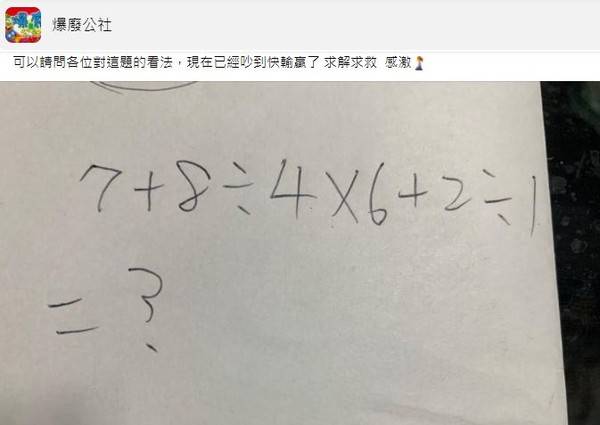 這道數學題目的答案到底是多少呢?一名網友15日在臉書社團中PO出一題數學題,希望大家幫忙解答,「現在已經吵到快輸贏了」,沒想到意外引發千人關注。網友們紛紛公開自己的算式,最後乾脆直接輸入計算機,得出答案為「21」。