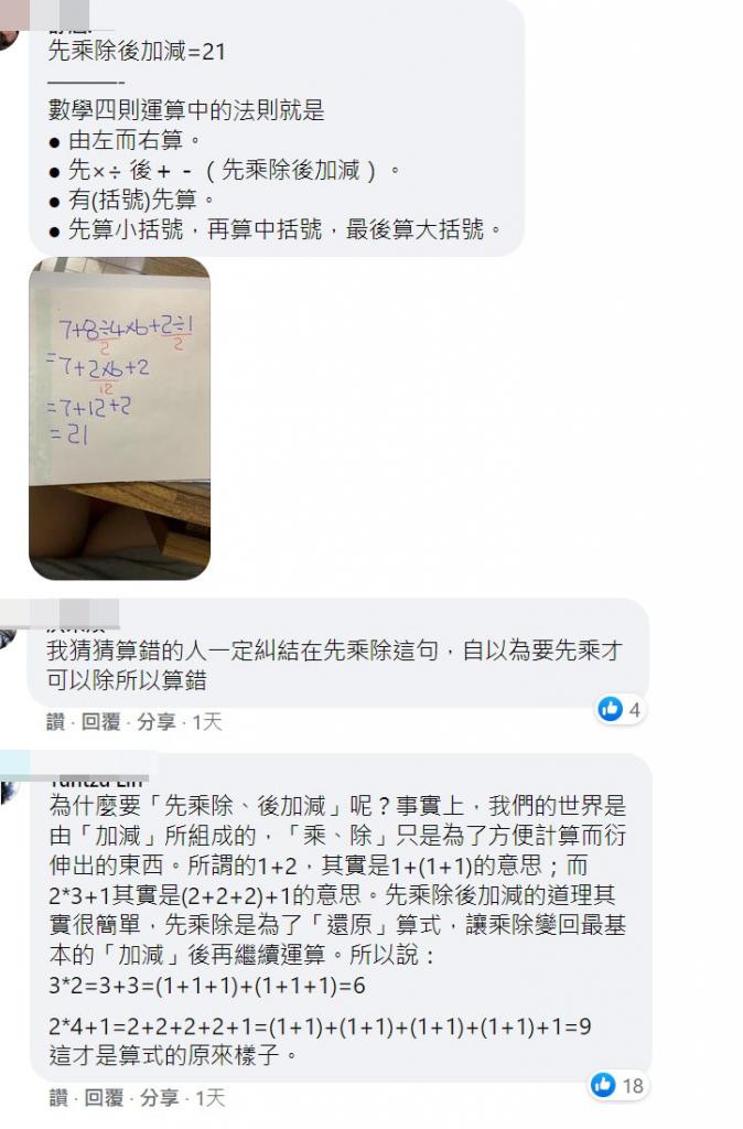 有趣的是,這道題目看似簡單,卻意外引起超過千人關注。至於正確答案到底是哪一個,有網友乾脆出動計算機,直接輸入算式後得到的答案是21,並留言開玩笑說,「這麼簡單的事吵什麼呀,把計算機當甚麼?」、「會吵就表示你們之中有 傻 瓜」。