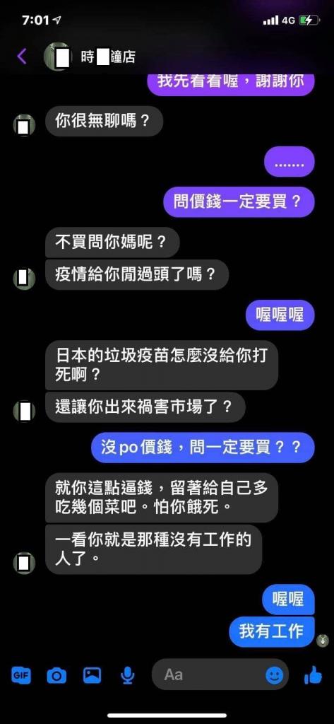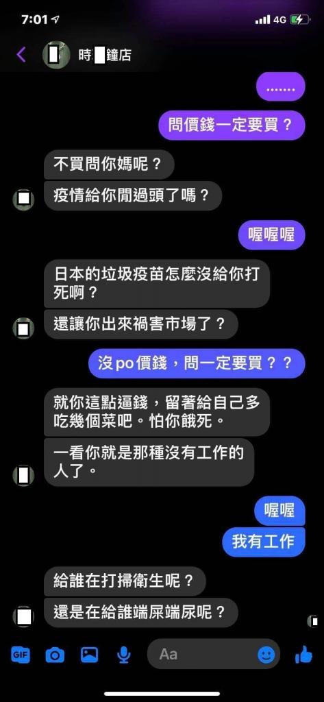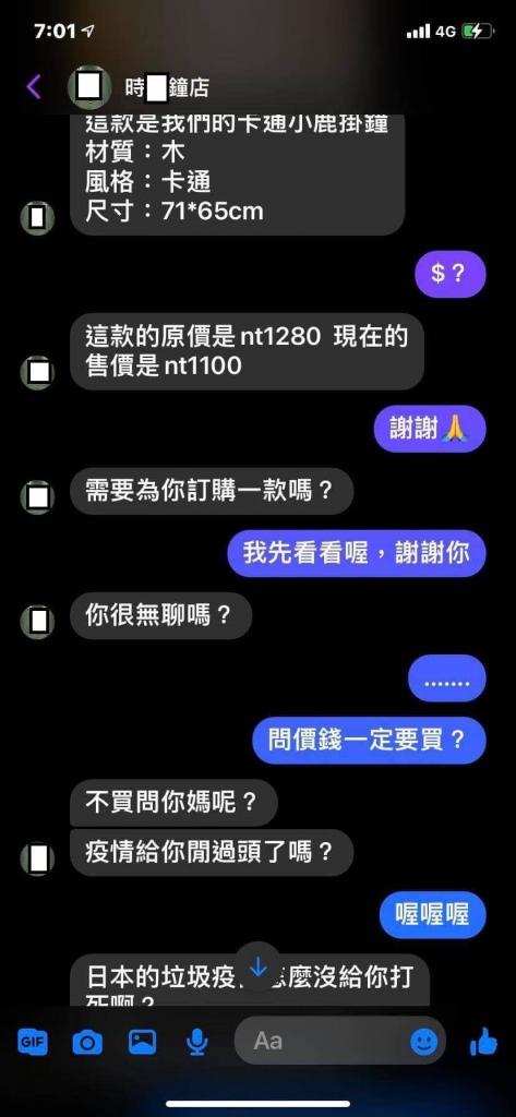 甚至質疑自己一定是沒工作沒收入才買不起時鐘,因對話太好笑也引發網友們共鳴「回他ㄍㄌㄋㄐㄅ啊」、「臉書上類似這樣的都不要買比較好,有的都是大陸的照片很可愛的女生」、「優良賣家,大家都來買。記得超商取貨付款哦~~~」、「台灣人真熱情~好多人去幫你討公道了」、「這可以弄個公然侮辱罪吧!太過份了!問一下有需要人身攻擊!」、「建議去蝦皮找,臉書很多詐騙,不然就是價錢差很多」、「這種就一直亂他啊」