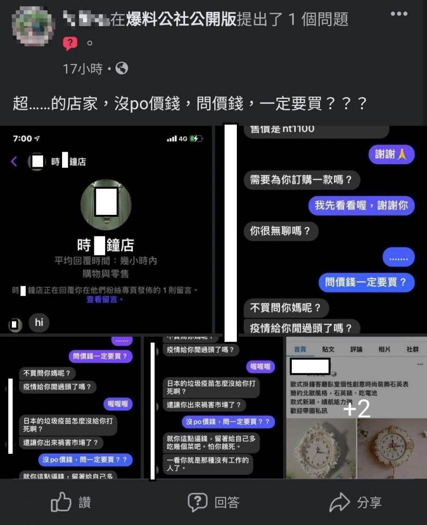 一名網友分享自己發生的惡劣購物經驗,表示因為賣家沒有將商品價錢標示清楚,因此私訊賣家詢問,一開始賣價態度還很良好,豈知看到自己說需要再考慮時竟口出穢言等難聽至極的話來攻擊自己。
