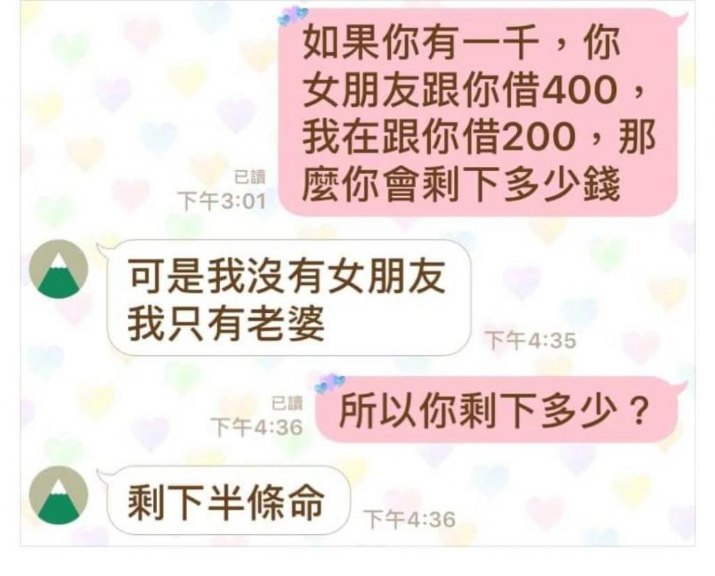 【老師:宸君今天你有一百元,你老婆跟你借了10元,你還剩多少錢?宸君:0元老師:你根本不懂數學!宸君:你根本不懂我老婆。】。
