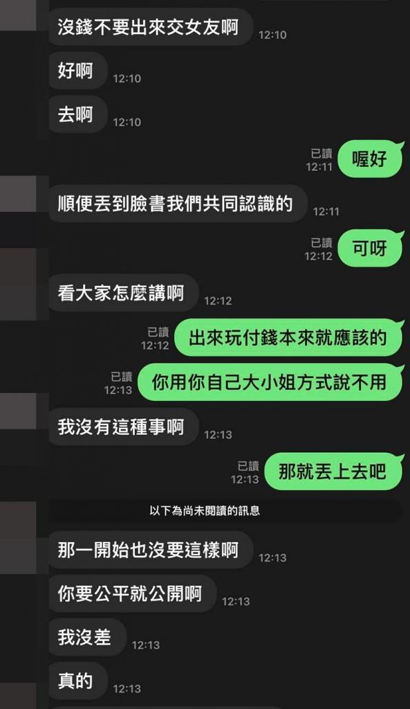 原PO貼出對話紀錄,只見女方無情嗆聲說「沒錢不要出來交女友啊!」,原PO則強調「出來玩付錢本來就應該的,你用自己大小姐方式說不用。」,雙方各執一詞,女方也認為自己沒錯,受的了大眾公評,因此重申「我沒有這種事(付錢)啊!你要公平就公開啊,我沒差」。