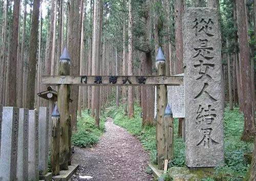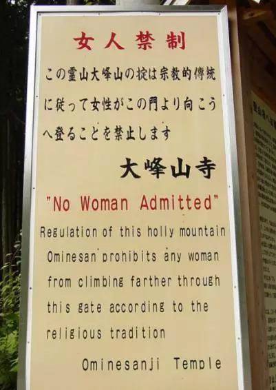 如今仍有個別山峰禁止女性攀登,比如:奈良有一座山,在入口處矗立著一塊大石碑,上面寫著 「従是女人結界」(從這兒開始禁止女人進入)