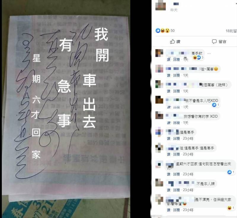 不過還是有一名「解碼專家」,超強翻譯成功,原來字條寫著:「我開車出去,有急事,星期六才回家!」讓大家恍然大悟,不過即使有對照圖,還是有人看不懂,揶揄:「還是看不出來啊!不會你就是寫字條的本人吧!!」
