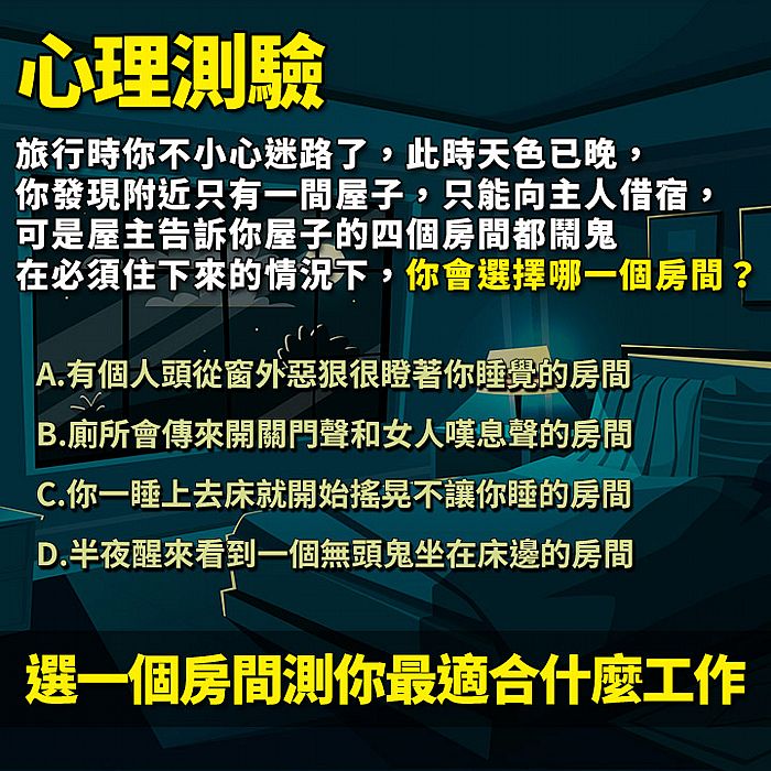 旅行時你不小心迷路了,此時天色已晚,你發現附近只有一間屋子,只能向主人借宿,可是屋主告訴你屋子的四個房間都鬧鬼,在必須住下來的情況下,你會選擇哪一個房間?