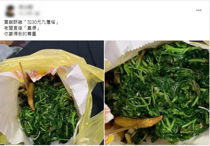 這名網友在「爆廢公社公開版」表示,購買鹹酥雞時,他向老闆加點了30元的九層塔,回家打開後發現,裡面裝了超大一坨九層塔,幾乎要塞爆紙袋,份量多到其他食材都看不見了,浮誇的份量讓原PO直呼,「你贏得我的尊重。」