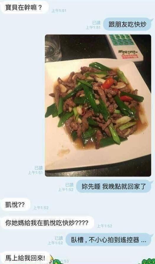 冰雪聰明的女友一眼就看到照片裡遙控器的重點:「你他媽給我在凱悅吃快炒????」